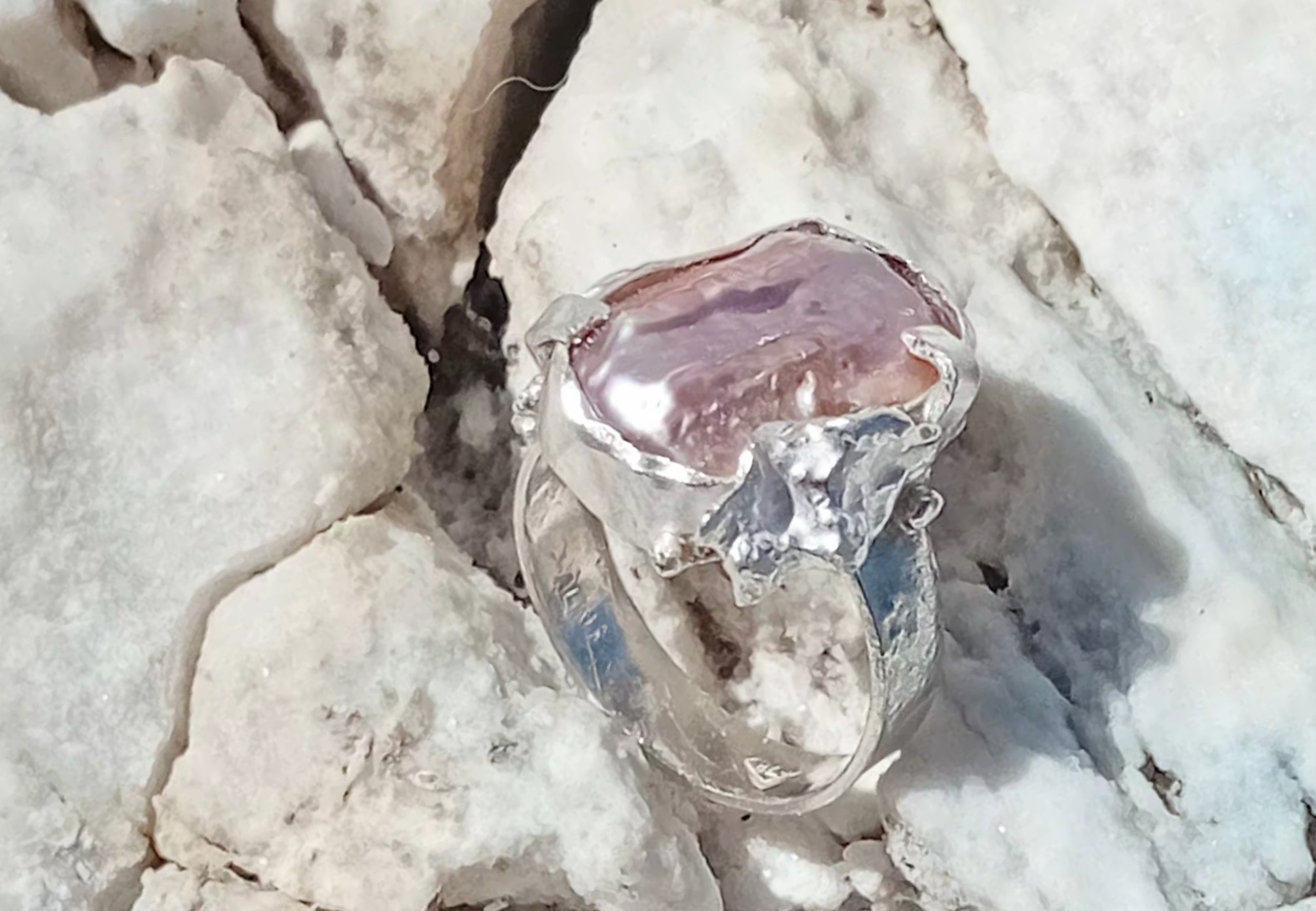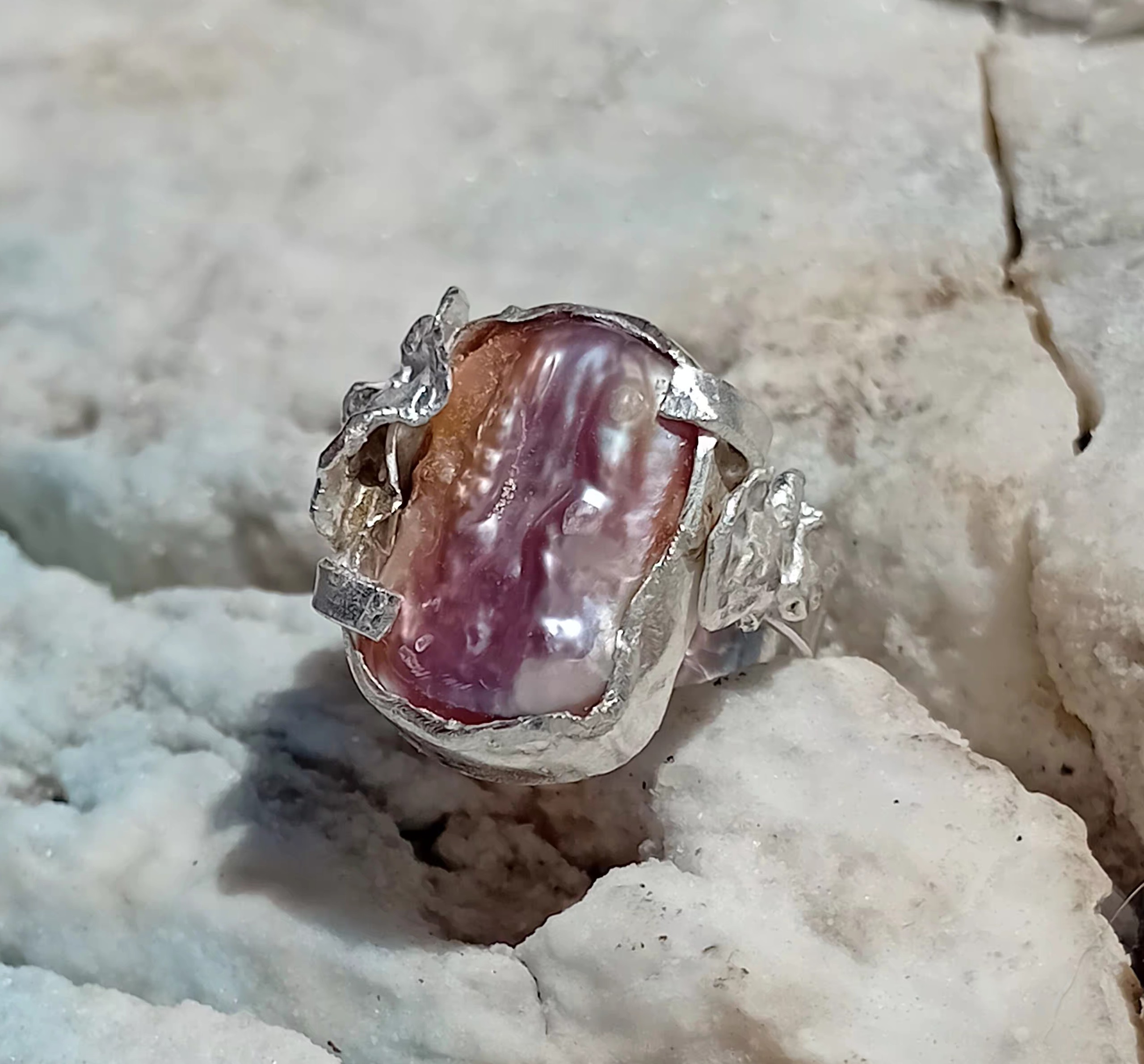 Una hermosa perla barroca rectangular es la protagonista de ésta historia, montada en plata 925,hecho a mano,número 15, pieza única