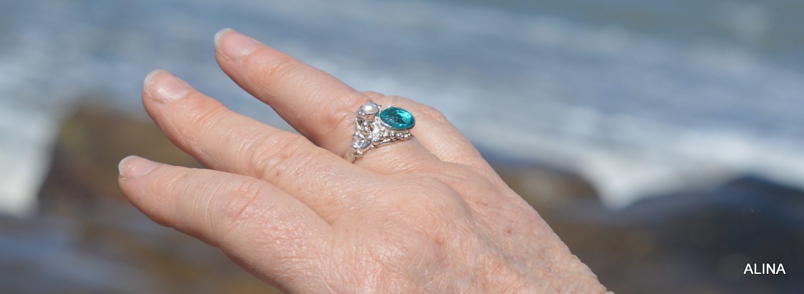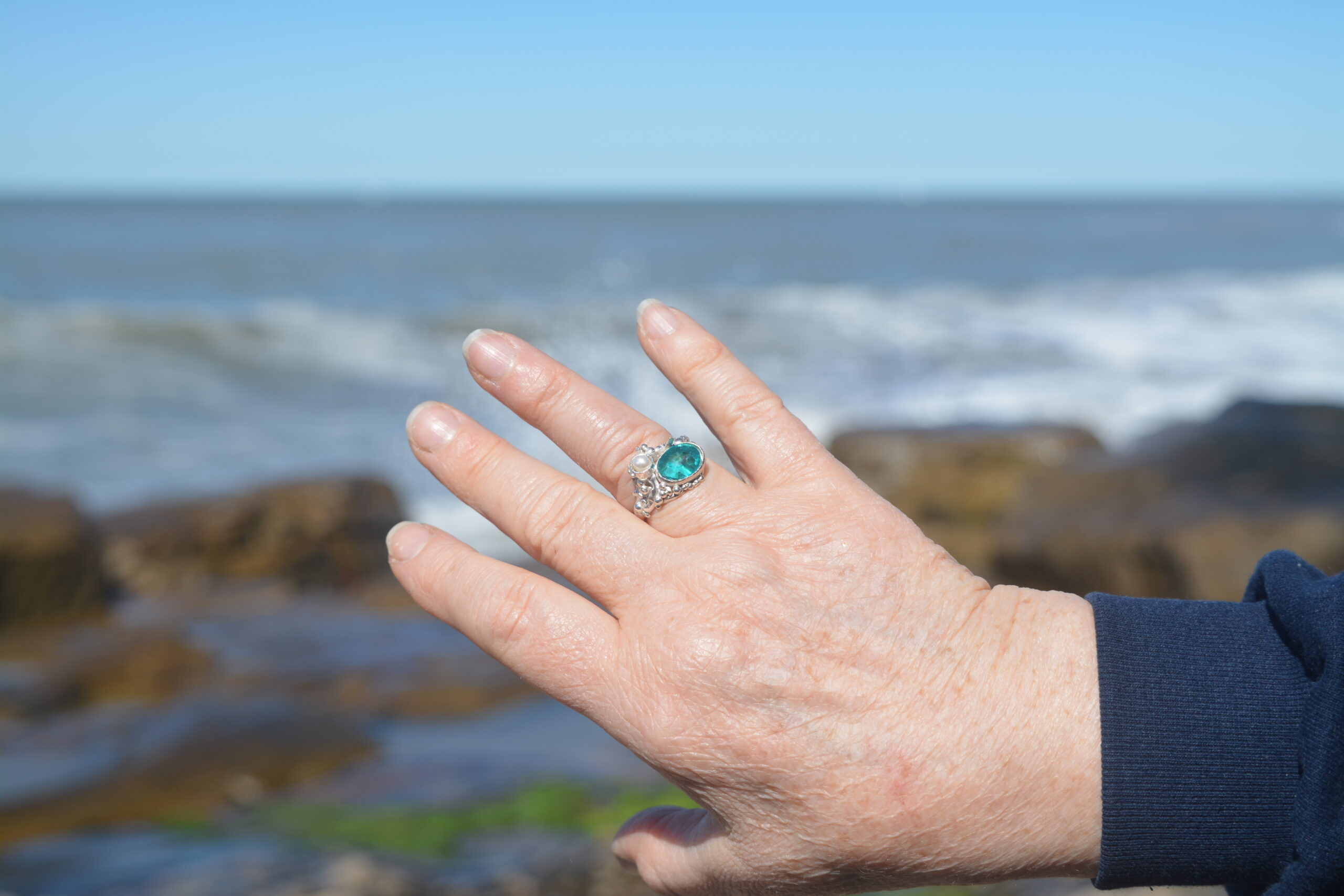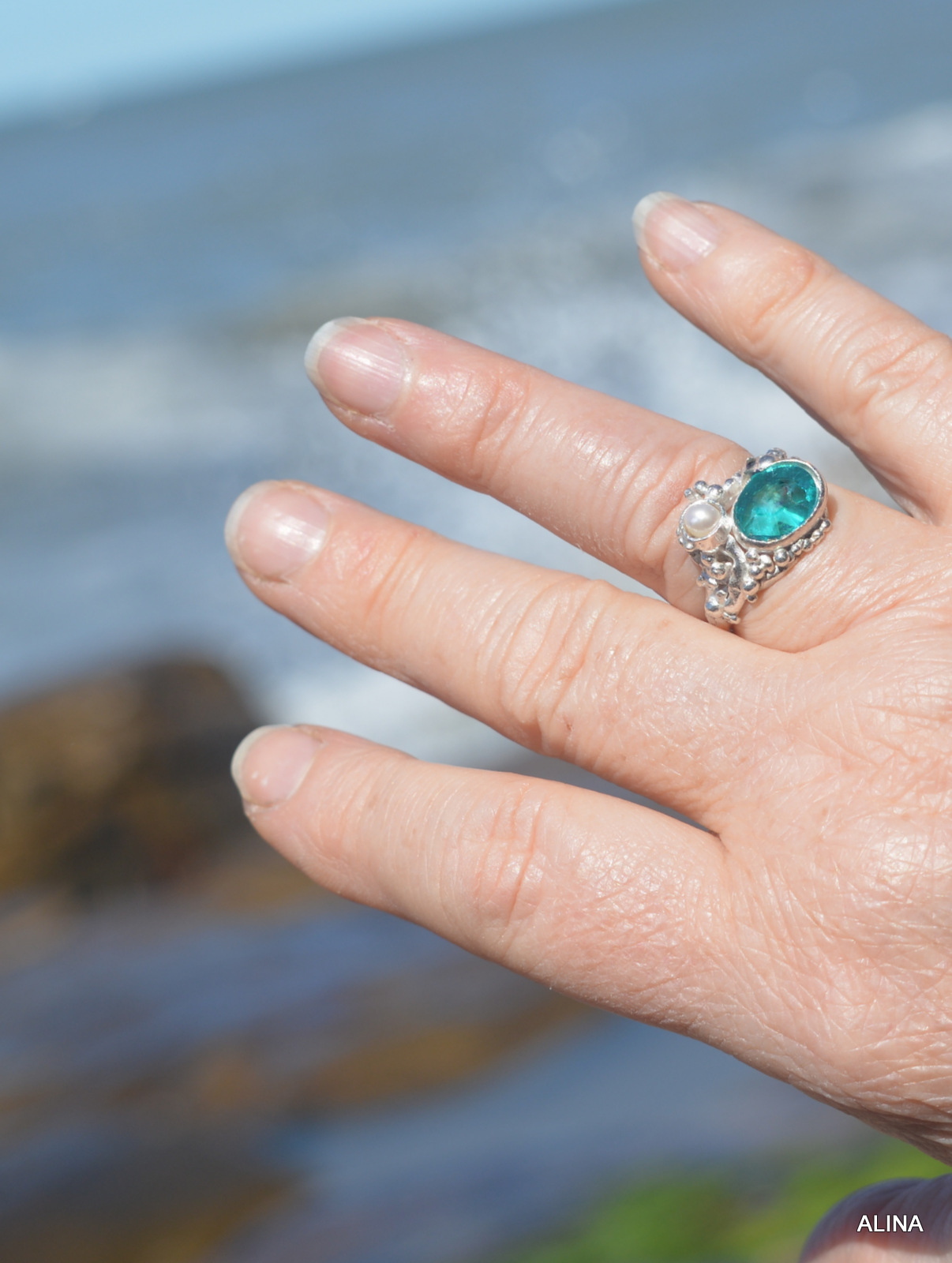 El color turquesa y el verano son aliados inseparables, estoy segura que a ti también te gusta…en éste anillo de plata 925 con piedra de apatito y perla natural, número 18, está modelado a la cera perdida y es una pieza única.