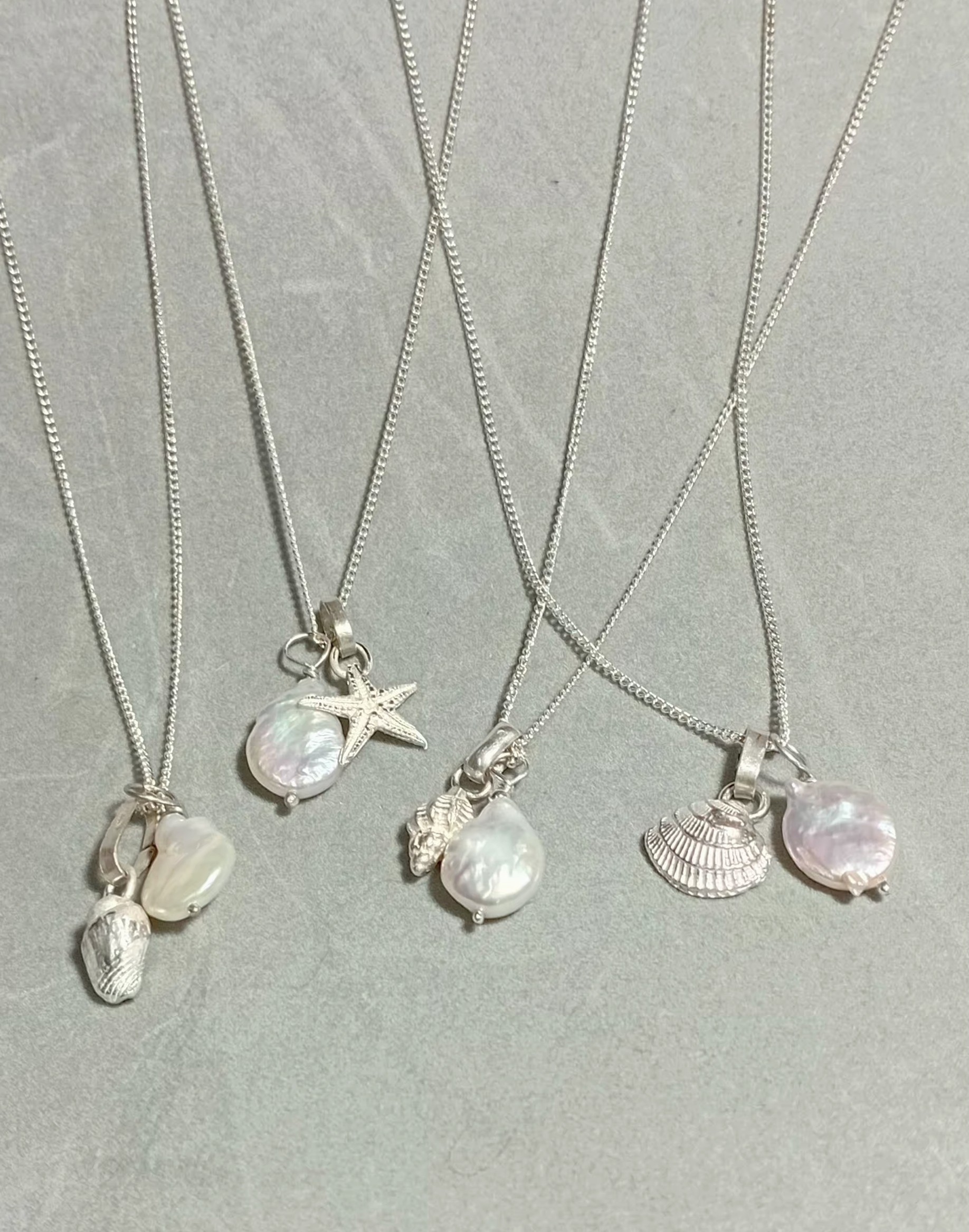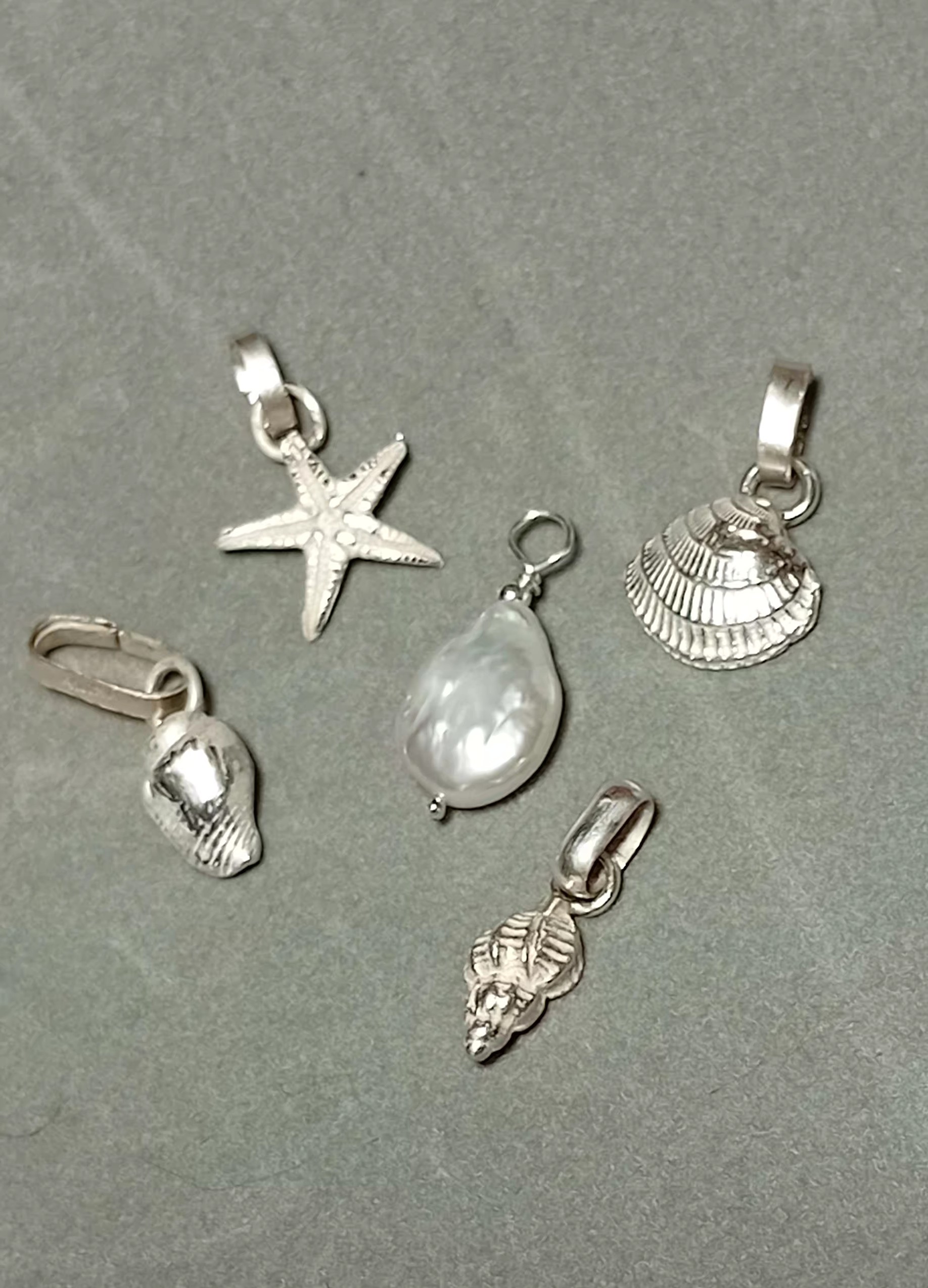 Qué buena junta!! Una fina y delicada cadena con piezas de plata 925, que representan habitantes del mundo marino( caracoles, estrellas, conchitas) todas modeladas a la cera perdida que junté con bellas perlas barrocas para sentir el placer de la naturaleza y su infinita belleza a nuestro favor!!!