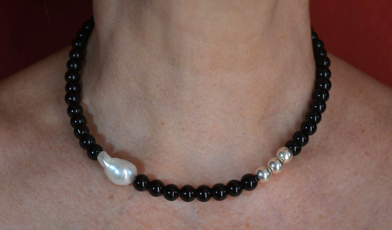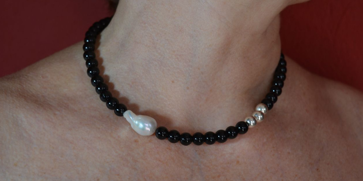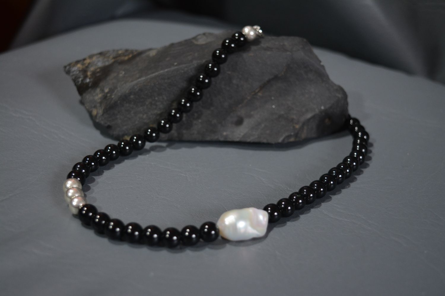 Gargantilla ideal para un look audaz, moderno y con un profundo sentido de protección personal y autenticidad.legancia a tope, el equilibrio de opuestos: fuerza-delicadeza, protección-pureza, y sofisticación moderna con toques ancestrales, contraste entre la fuerza intensa de la obsidiana y la suavidad de la perla barroca crea un equilibrio energético, ideal para quienes buscan protección (obsidiana) sin perder la conexión con la armonía y la intuición (perla).