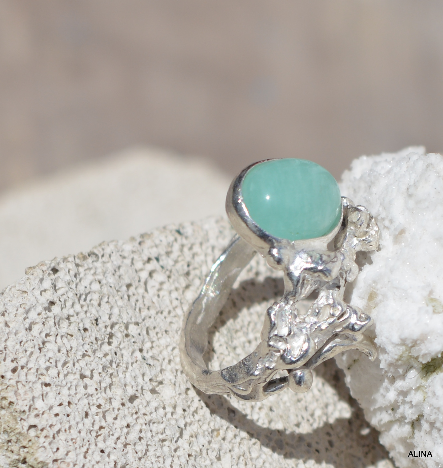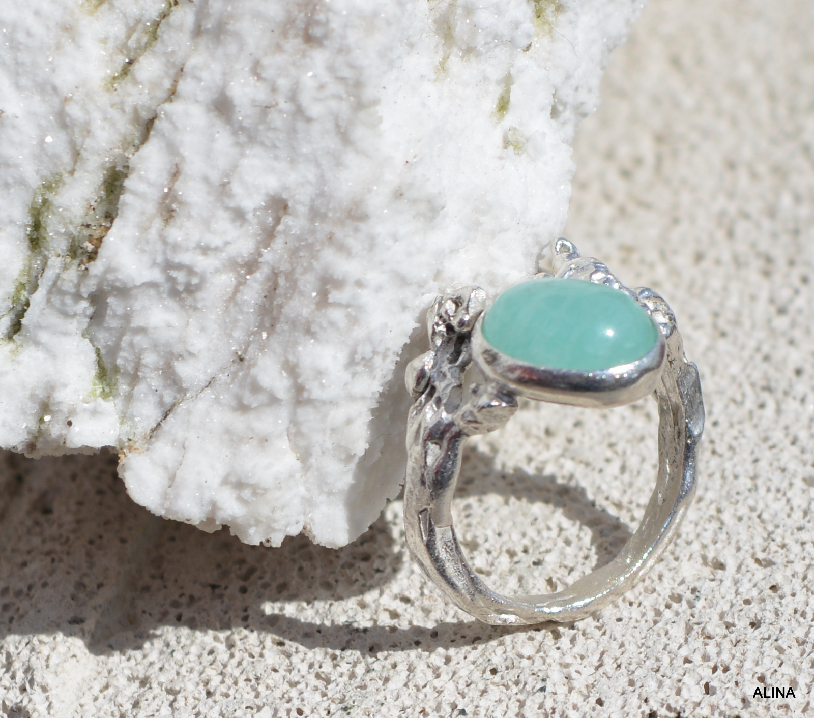 Marella es un nombre femenino que significa «mar brillante», en la cultura celta…y éste anillo de plata 925, está inspirado en el brillo del mar al atardecer, el verde suave de la piedra amazonita imperial, la delicadeza que le da las formas modeladas, estoy segura que te hará sentir el fluir de las olas suaves …