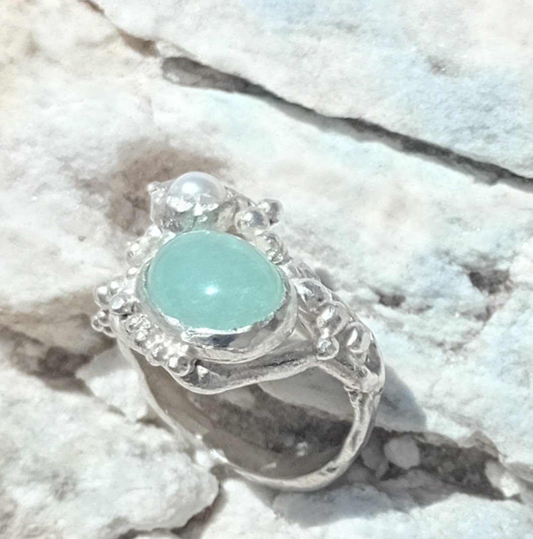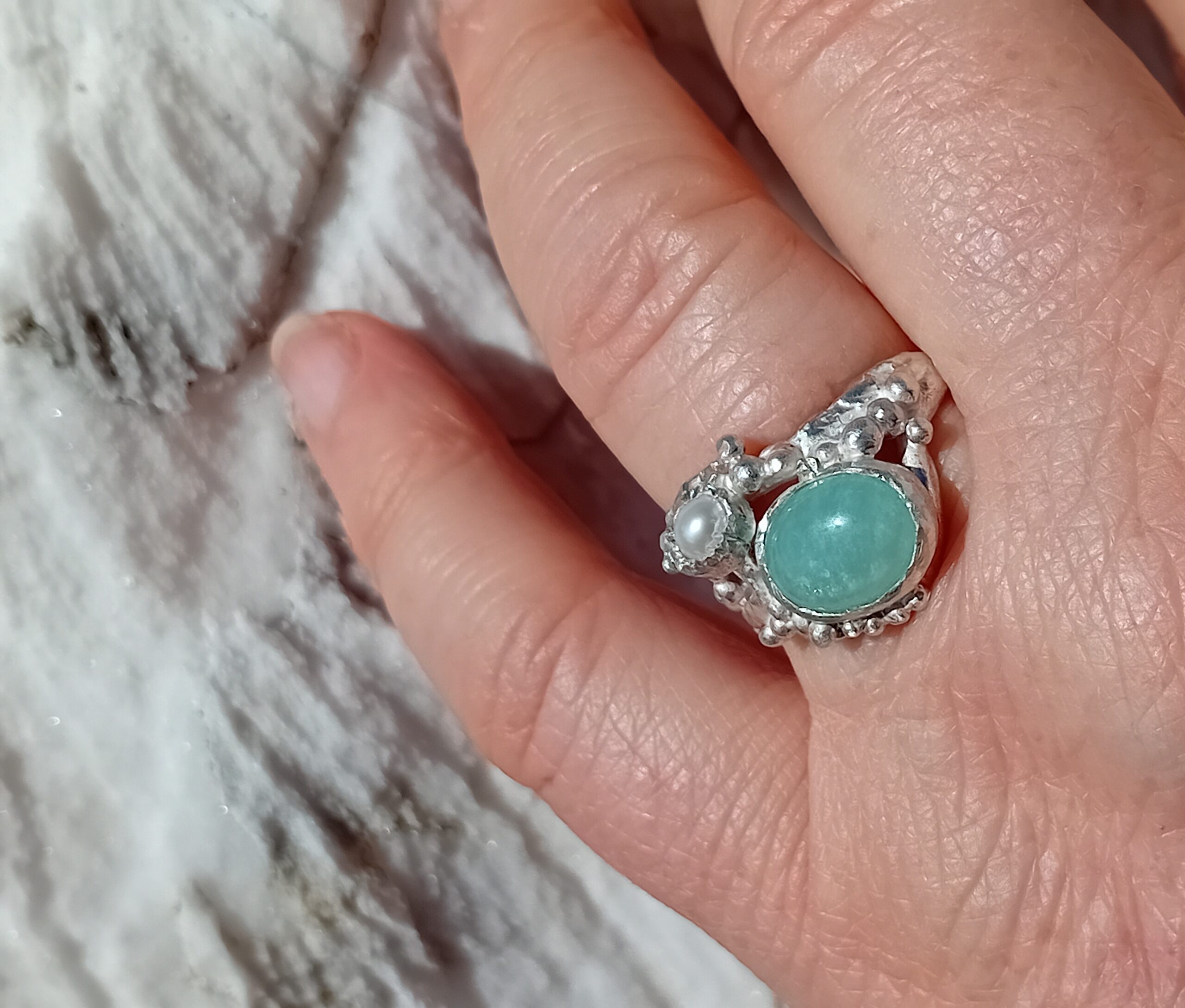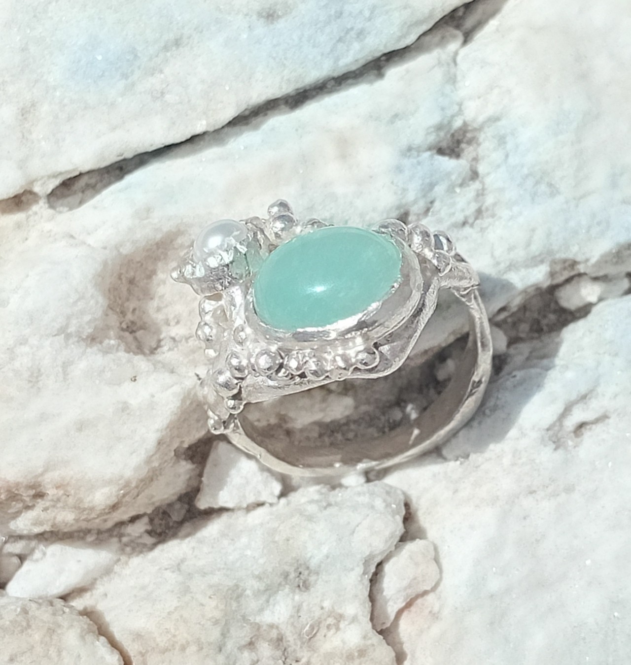 Delicado y vivas éste anillo de plata925 con piedra de amazónica y perla natural de agua dulce, es una pieza única, #!17