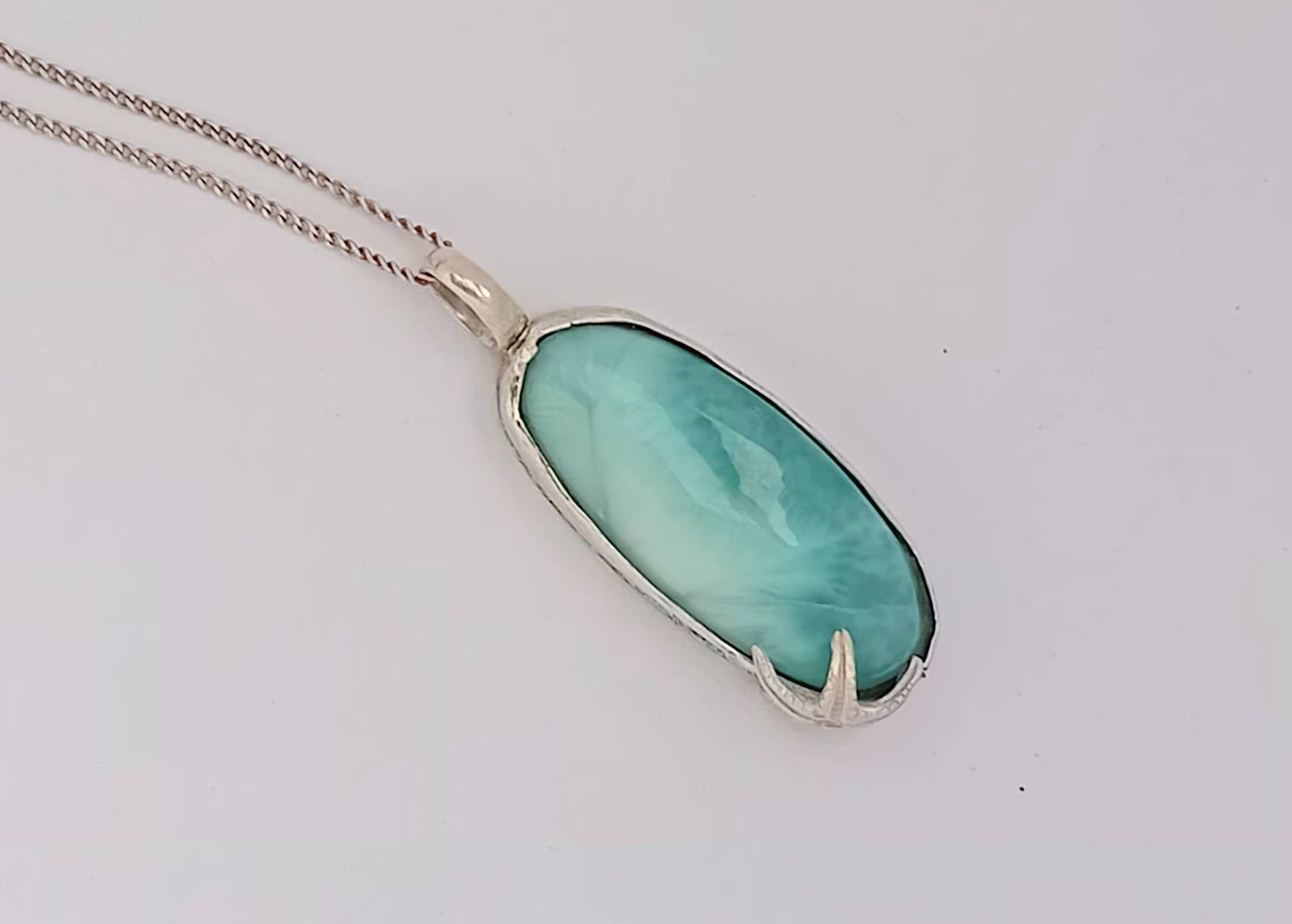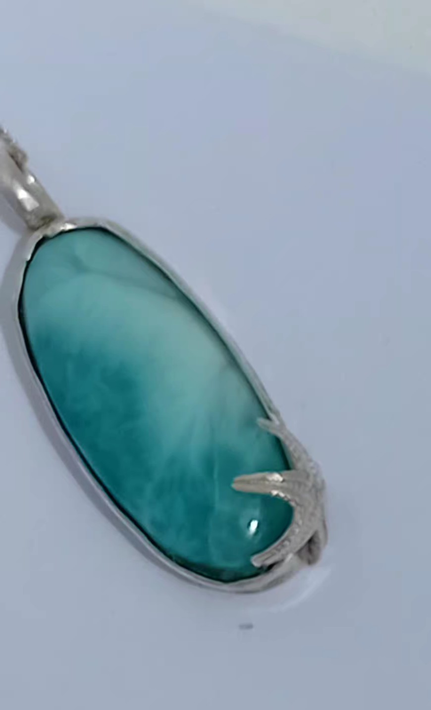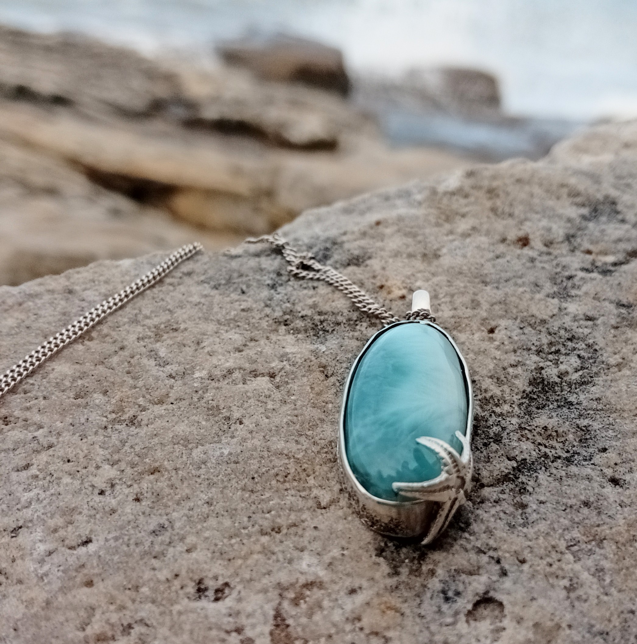 Un colgante para que todos te miren, porque el color turquesa de la piedra larimar es único, montada en plata 925, se distingue en la parte baja una estrella de mar que nombre a ésta joya,con cadena de plata.