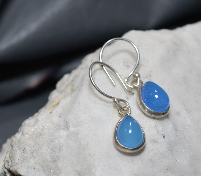 aros de plata 925 hechos a mano, con engaste de ágata calcedonia azul.