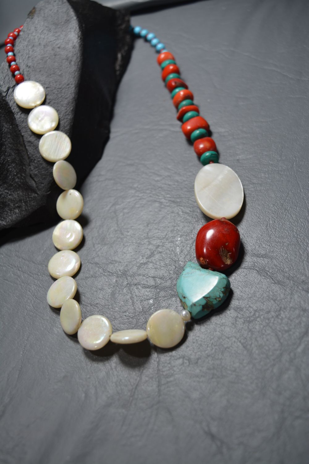 El nácar aporta intuición y calma, el coral rojo vitalidad, pasión y defensa contra el mal de ojo, mientras la turquesa representa sabiduría y buena fortuna, creando una pieza que equilibra emociones y atrae energía positiva.