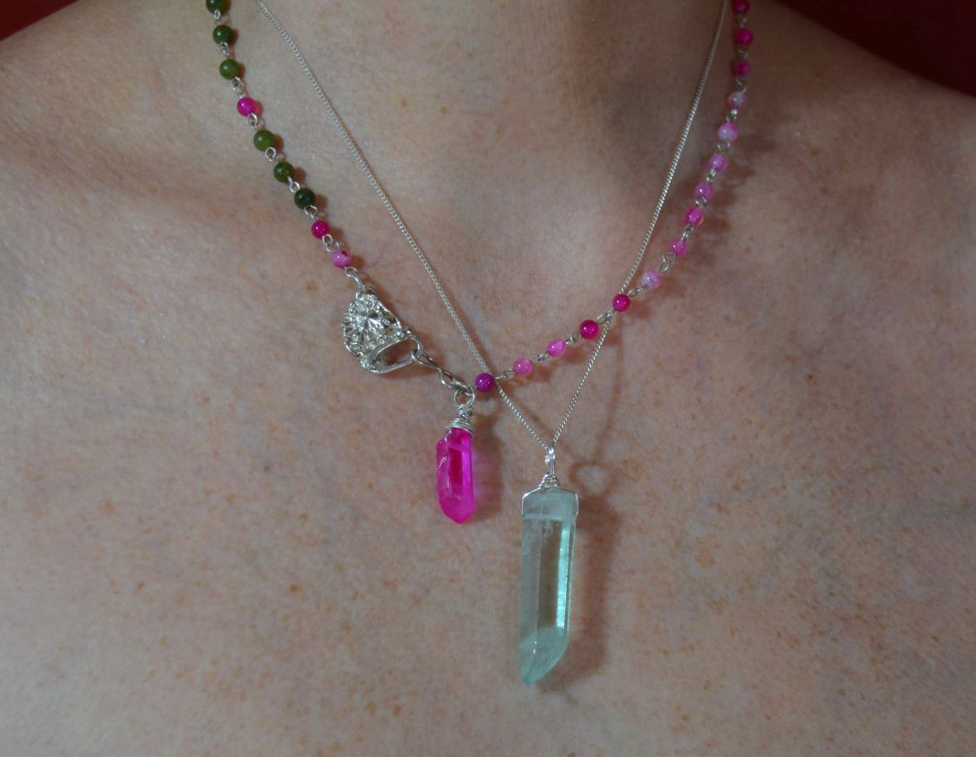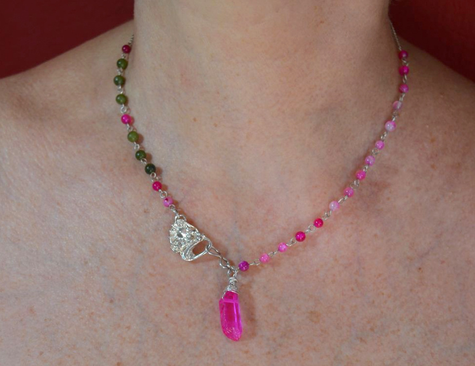 El amor propio y la seguridad, con un toque moderno dado por la combinación de colores, verde y fucsia, con cuentas de jade y ágatas fucsia rosa, una hermosa pieza de uso diario con la que te verás muy juvenil.