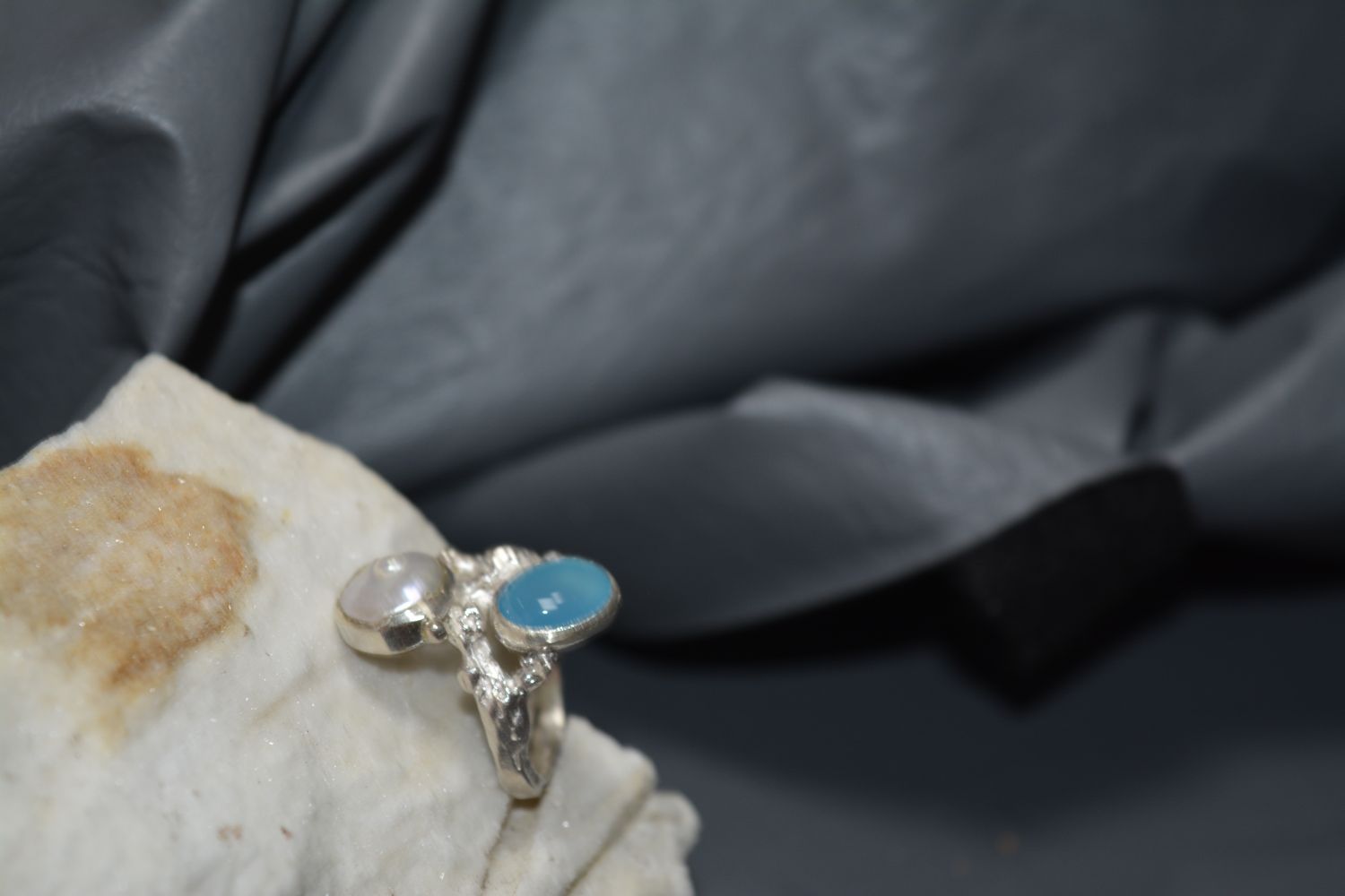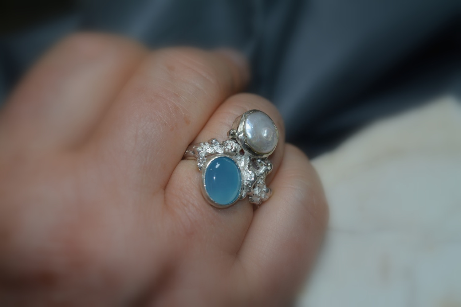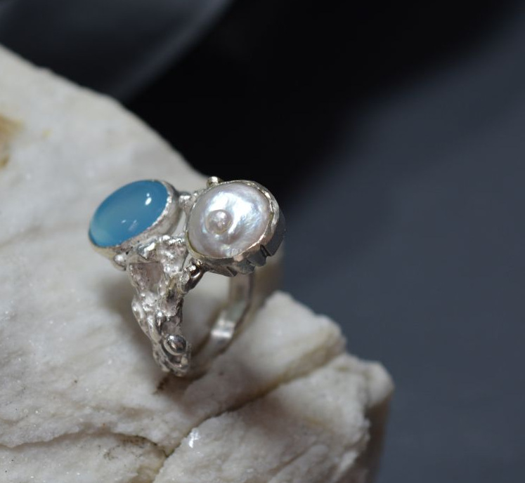 Anillo de plata 925 con piedra de ágata calcedonia azul y perla natural, número #18, modelado a la cera perdida, es una pieza única, firmada, con certificado de autenticidad, se entrega con estuche para regalo.
