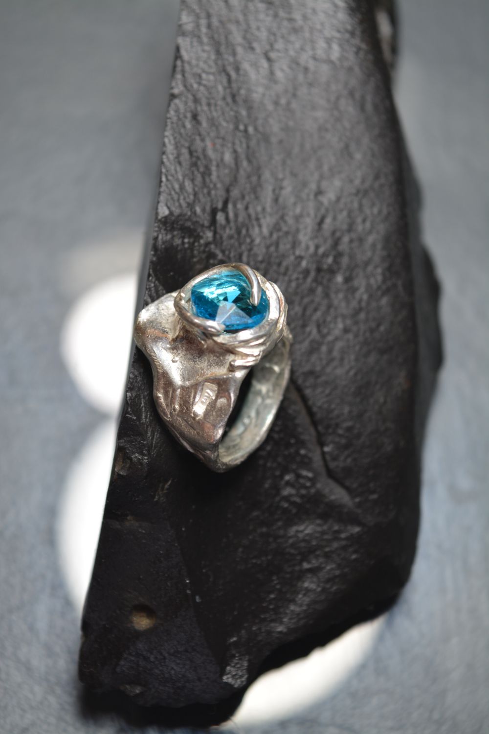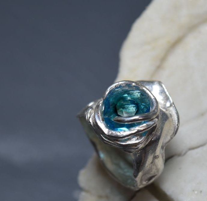 La hermosa piedra de Apatito, corona el centro de éste anillo modelado a la cera perdida en plata 925, es una pieza única, número #21, se entrega en estuche de regalo, con certificado de autenticidad.